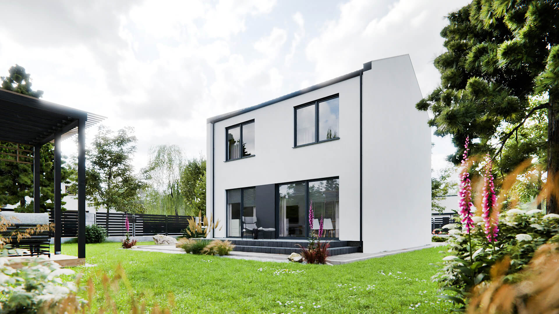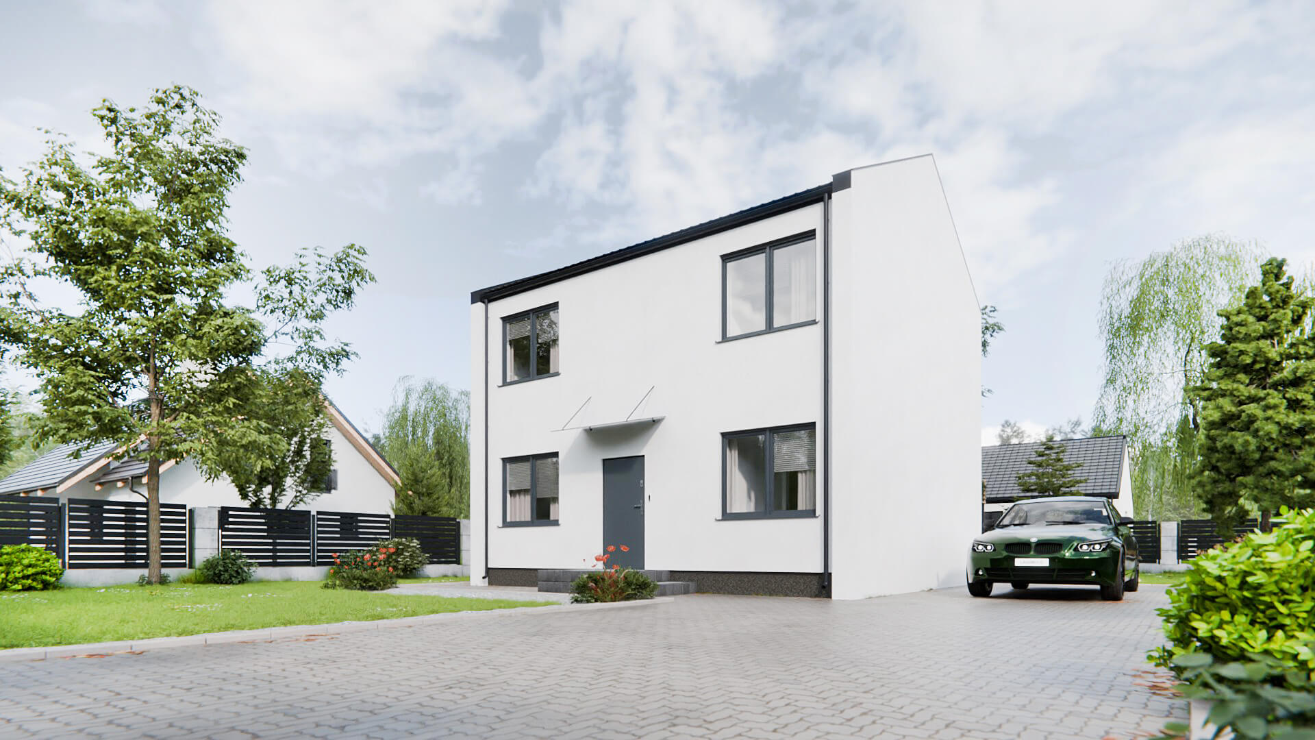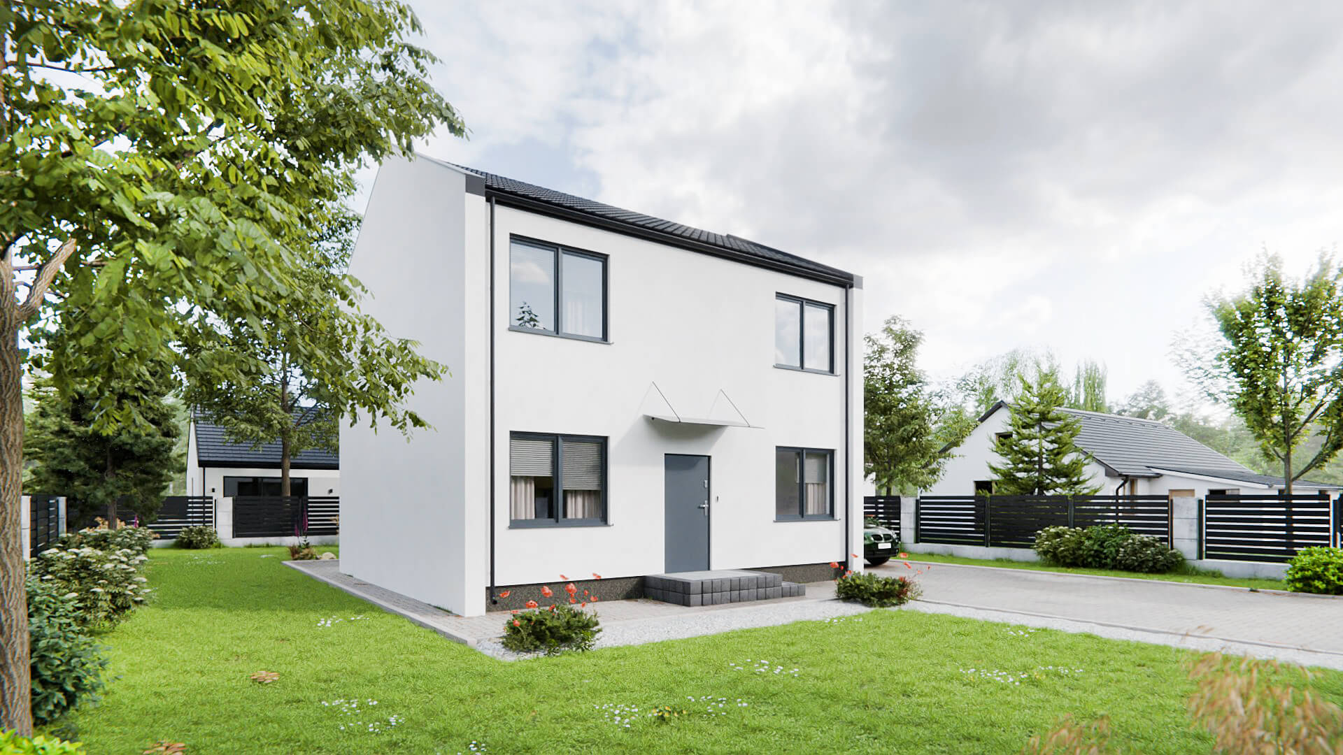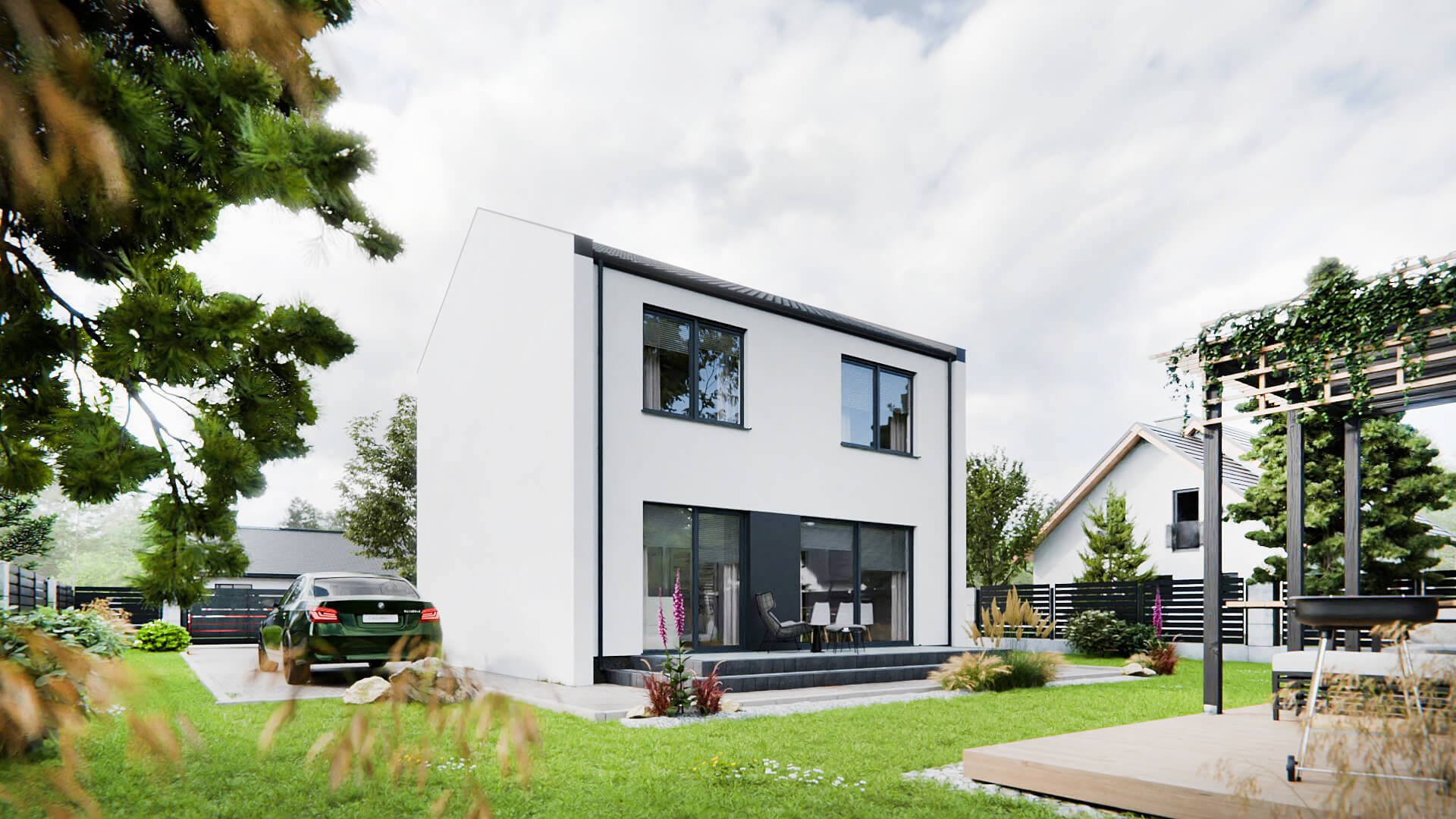 Na płyty STEICO protect nakładany jest klej, siatka a następnie tynk cienkowarstwowy. W zależności od projektu w elewację mogą być wkomponowane ozdobne elementy drewniane ze świerku skandynawskiego lub cała elewacja wykonywana jest z deski elewacyjnej.