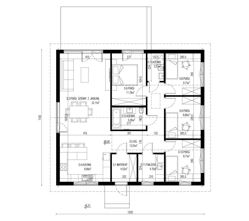 Model L to parterowy dom o powierzchni użytkowej 113,86 m², zaprojektowany z myślą o rodzinach poszukujących przestrzeni, wygody i nowoczesnego stylu. Układ wnętrza obejmuje cztery komfortowe sypialnie, które zapewniają prywatność i funkcjonalność każdemu domownikowi. Dwie łazienki gwarantują wygodę codziennego użytkowania – zarówno dla większych rodzin, jak i gości.